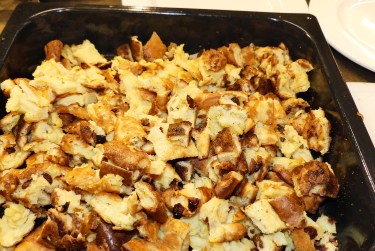6 Stk. Eier schlampig unterrühren bis der Dotter gleichmässig verrührt und das Eiweiß immer noch seine grobe Konsistenz behält! Das Emaillebackblech bei 210°Grad und geringer Luftfeuchtigkeit (30% Luftfeuchtigkeit) vorheizen. Die Butter im heißen Blech verteilen und dann den Teig und die Rosinen einfüllen. Backzeit ca. 30 min. bis er schön gleichmäßig braun ist.