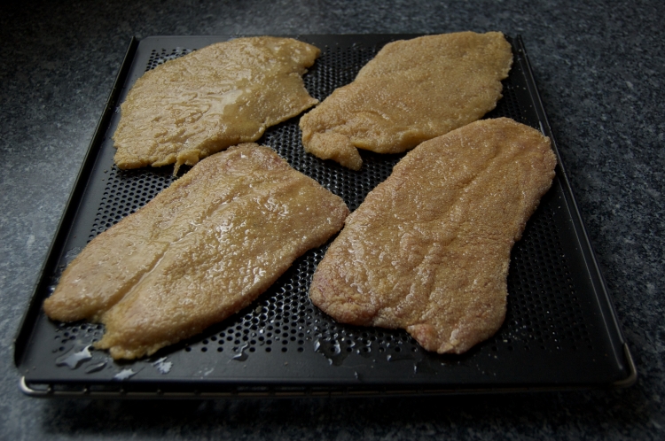 Die Schnitzel würzen und in Mehl - Ei - Brösel wie gewohnt panieren. Anschließend auf allen Seiten dick mit Öl einpinseln - siehe Foto. bzw. siehe Foto Backhendel...