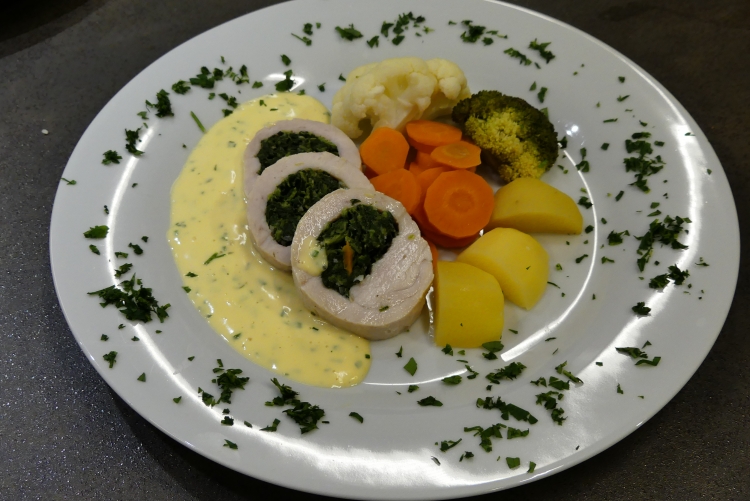 - mit Kartoffeln, Gemüse und Kräutersauce servieren