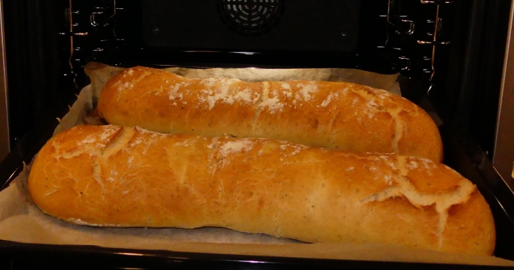 In einer Schüssel ca. 50 min. gehen lassen. Teig zusammen nehmen und runde Laibe oder Baguettestangen formen und weitere 30 min. gehen lassen. Vor dem Einschießen einschneiden und mit Wasser besprühen, bei ca. 250°Grad für ca. 40 min. backen. Kleingebäck ca. 20 min. backen.