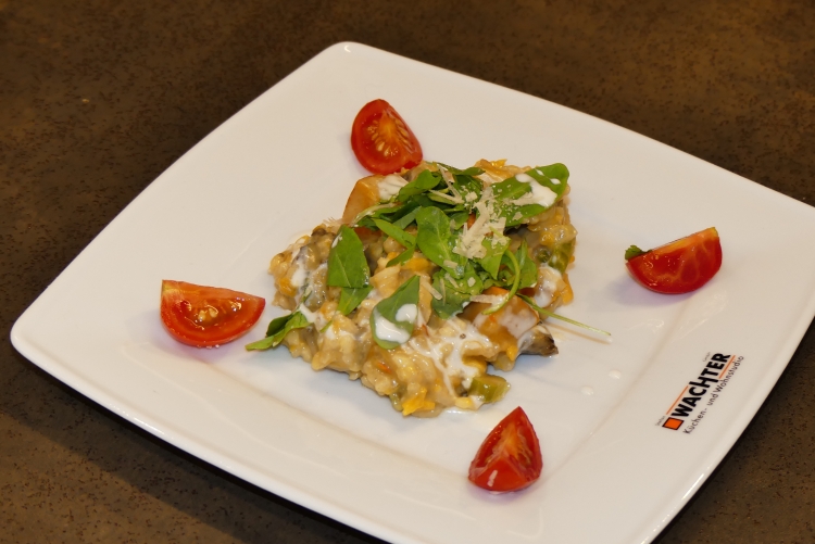 Zum Servieren einfach Ruccola oder ein paar Kürbis-Pilze übriglassen und frisch aus der Pfanne darüberstreuen!!!