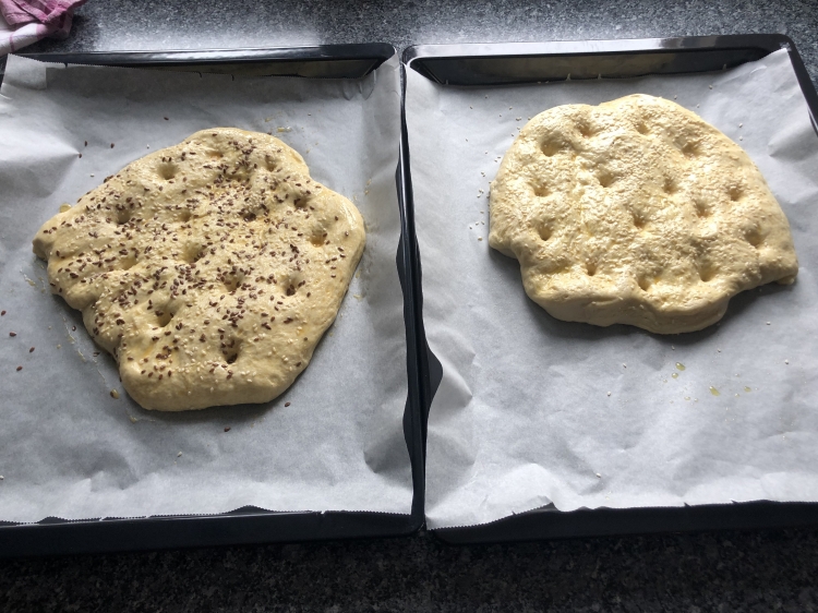 jeweils in einer Schüssel, zugedeckt ca. 2 Stunden gehen lassen. Dann vorsichtig auf ein Backblech mit Backpapier leeren und nochmal ca 30 min. gehen lassen. Den Stiel eines Kochlöffels in etwas Öl tauchen und dann die typischen Löcher vom Fladenbrot vorsichtig eindrücken, mit Ei-Wassergemisch bestreichen und Sesam bestreuen.